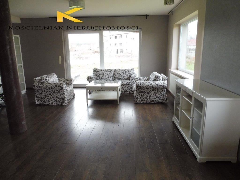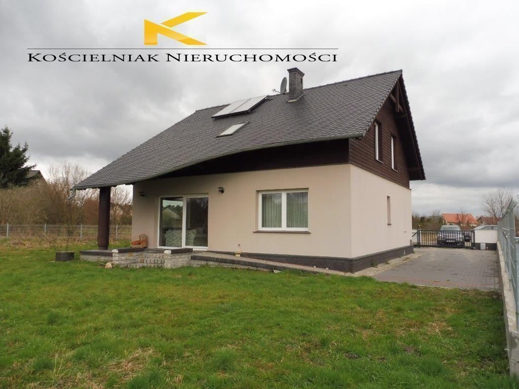 Dom jednorodzinny, wolnostojący, niepodpiwniczony z poddaszem użytkowym, 4-pokojowy, na działce 1000 m2, w pełni ogrodzonej z podjazdem, tarasem i gankiem wyłożonymi kostką granitową. Brama sterowana automatycznie, miejsca postojowe przed domem.